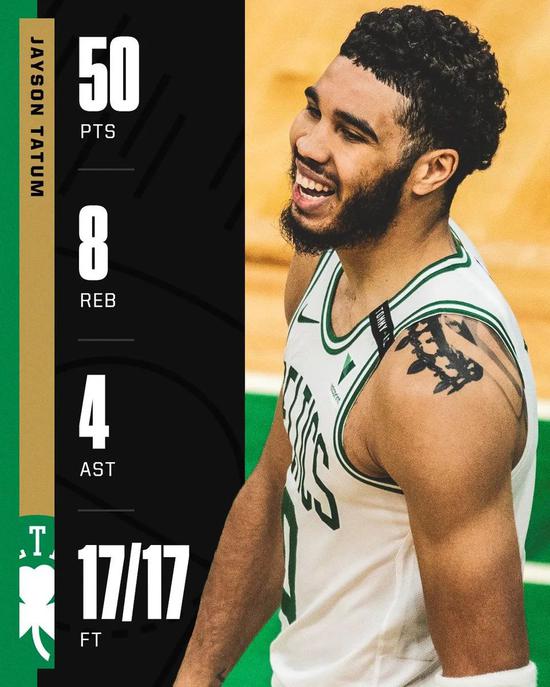 全场比赛,塔图姆无疑是绿军首功之臣,首发出战40分钟的他32投14中,三分球12投5中,罚球17罚17中得到50分8篮板4助攻1抢断2封盖。
