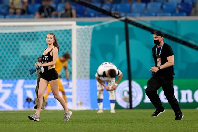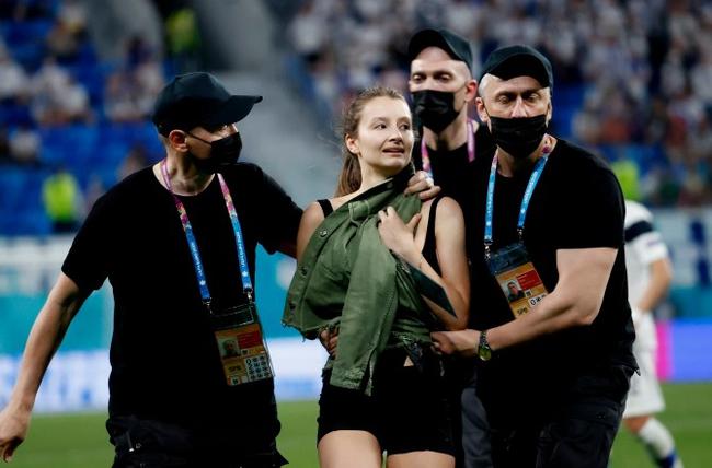 欧洲杯小组赛第3轮,比利时对阵芬兰进入补时,一名女子闯进球场,造成比赛暂停。