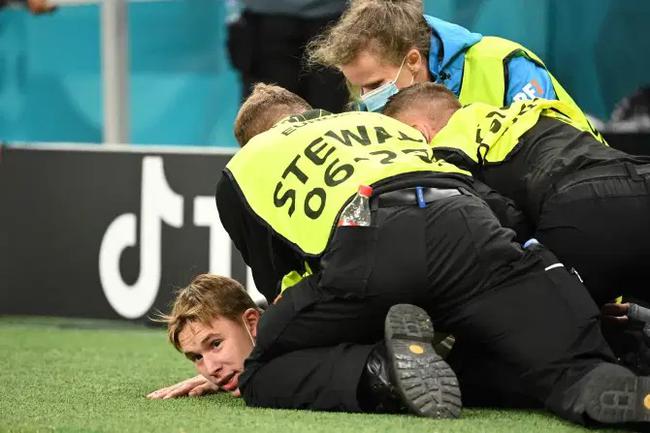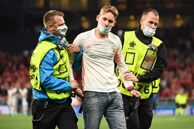 在俄罗斯对丹麦比赛中,也有一人身穿俄罗斯球衣冲场,同样被带走。