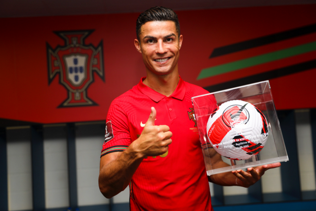C罗终场前两记头槌,帮助葡萄牙世预赛2比1逆转,以111球创造男足国家队进球世界纪录。葡萄牙足协赛后给他颁发了别致的“奖杯”。