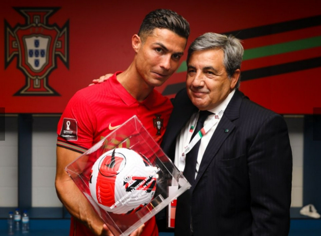 葡萄牙足协主席费尔南多-戈麦斯颁给C罗一个透明盒子,盒子里面装着此役比赛用球,盒子表面刻上了比赛日期等信息。